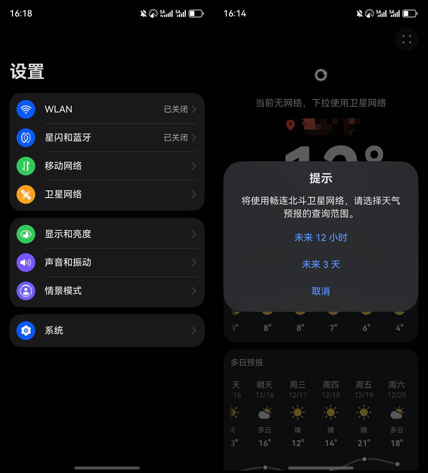 哪怕營(yíng)地完全沒(méi)有信號(hào),現(xiàn)在也不用慌。有網(wǎng)絡(luò)時(shí)提前在設(shè)置-衛(wèi)星網(wǎng)絡(luò)里打開“暢連北斗衛(wèi)星消息”后,我可以切換到衛(wèi)星網(wǎng)絡(luò)模式,能查看未來(lái)12小時(shí)、最長(zhǎng)3天的天氣數(shù)據(jù)。手里有這個(gè)戶外神器,再也不必?fù)?dān)心與世隔絕和天氣突變了。