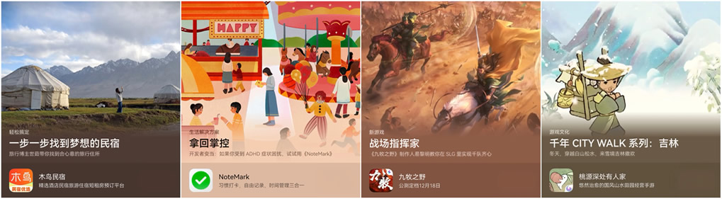 此時(shí)北極圈內(nèi)正處極光季,如果想去北極圈追光,可以在AppGallery查看“終極旅行:追極光”專(zhuān)題,藍(lán)冰,極光,限定美景這個(gè)冬季一次滿足!此外,AppGallery還有更多精品專(zhuān)題,如熱播影音展覽、拍攝美化指南、旅游出行攻略、生活實(shí)用妙招、精品游戲介紹等。要是刷到感興趣的內(nèi)容,只需在Story頁(yè)面底部點(diǎn)擊“分享”按鈕,就能一鍵轉(zhuǎn)發(fā)給好友,共享精彩內(nèi)容和APP。在“探索”頁(yè)面,還有很多如一步一步找到夢(mèng)想的民宿、拿回掌控、戰(zhàn)場(chǎng)指揮家、千年CITY WALK系列:吉林等專(zhuān)題,總能找到合你心意的內(nèi)容。
