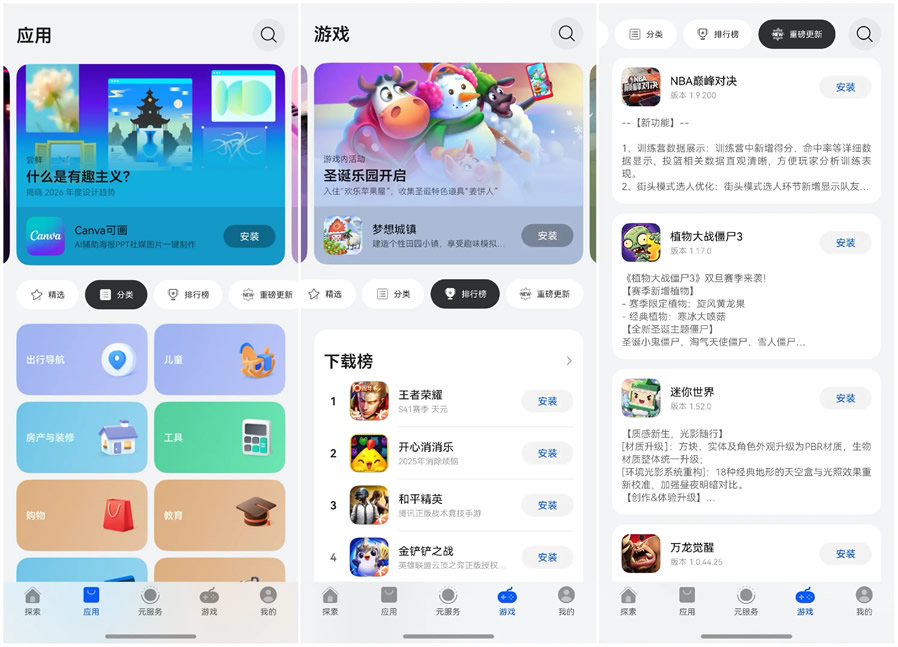 體驗(yàn)路徑:打開(kāi)AppGallery,在“應(yīng)用”或“游戲”頁(yè),點(diǎn)擊腰部的“分類(lèi)”、“排行榜”或“重磅更新”查看