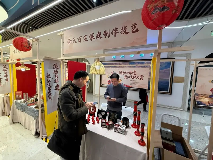 掛上紅燈籠,擺上精致的剪紙、竹編、漆器,一個熱鬧的非遺市集開張了。作為“上海新年第一游”寶山主會場活動的組成部分,昨天,“流動的非遺·長江文化大賞”率先在寶山濱江的上海·海上世界商圈拉開序幕。