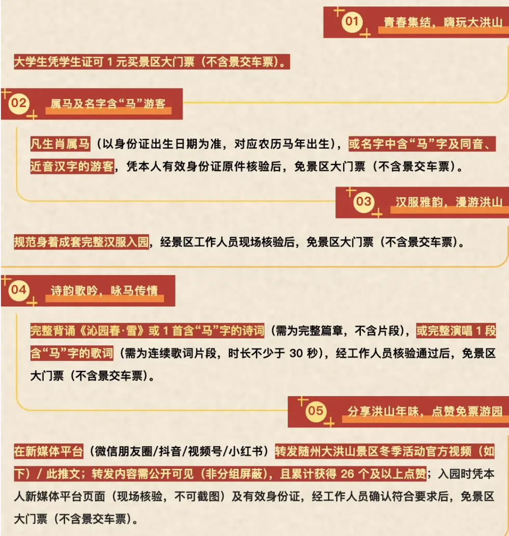 此外,隨州大洪山風(fēng)景名勝區(qū)發(fā)布的消息還顯示,規(guī)范身著成套完整漢服入園,經(jīng)景區(qū)工作人員現(xiàn)場(chǎng)核驗(yàn)后,免景區(qū)大門票(不含景交車票);完整背誦《沁園春·雪》或 1 首含“馬”字的詩(shī)詞(需為完整篇章,不含片段),或完整演唱 1 段含“馬”字的歌詞(需為連續(xù)歌詞片段,時(shí)長(zhǎng)不少于 30 秒),經(jīng)工作人員核驗(yàn)通過(guò)后,免景區(qū)大門票(不含景交車票)。