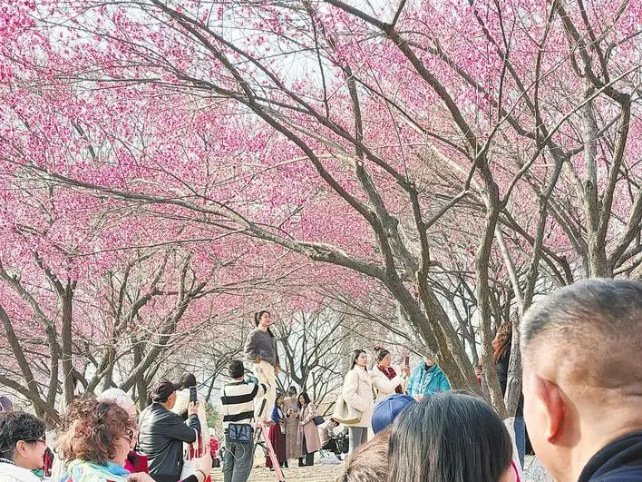 雖是工作日午后,坡上已有數(shù)百位市民游客漫步賞玩;ㄓ叭顺敝,除了專程而來(lái)的攝影愛好者架起“長(zhǎng)槍短炮”,更有許多家庭扶老攜幼,在梅林間游玩、野餐。曾是約拍行業(yè)淡季的隆冬時(shí)節(jié),也成了旺季。“花期比往年早了近一個(gè)月,好幾個(gè)周末的‘約拍’都排滿了。”攝影愛好者周女士邊調(diào)整鏡頭邊說(shuō)。據(jù)攝影師“四葉草”介紹,周末這里人流如織,即便今天是工作日,前來(lái)拍照的游客依然不少。“目前‘梅花坡’花開得最盛,大家都搶著來(lái)出片,競(jìng)爭(zhēng)壓力不小。眼下的梅花是開年第一波熱度。”