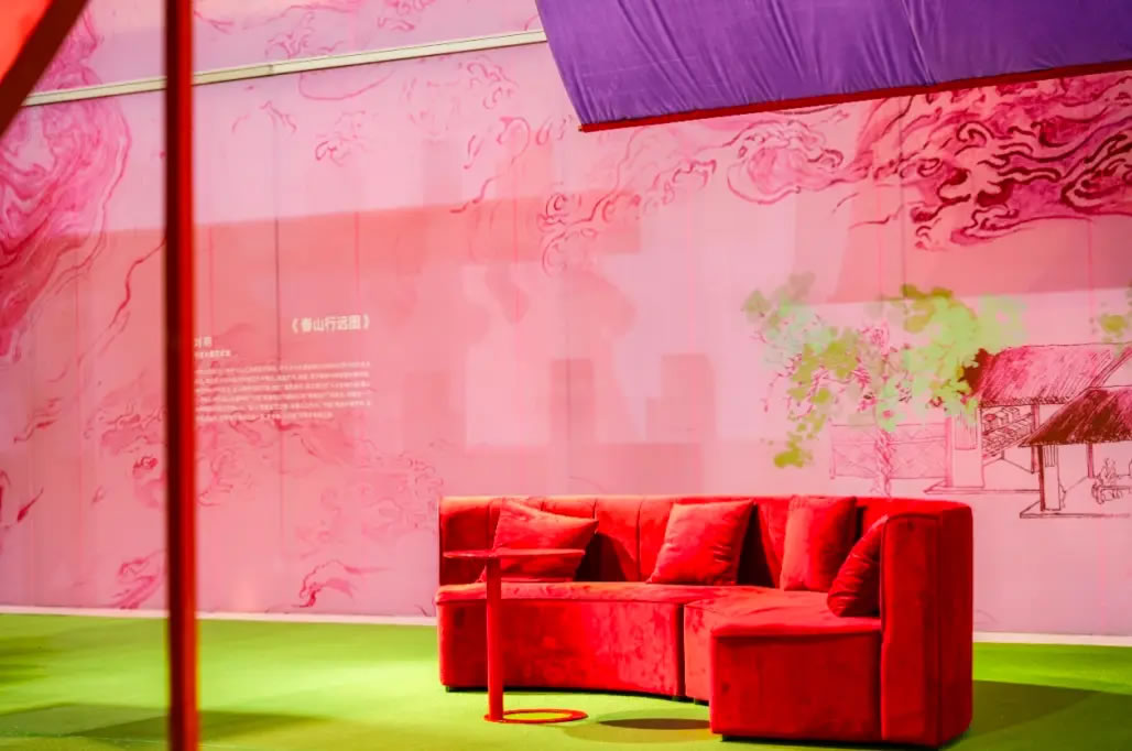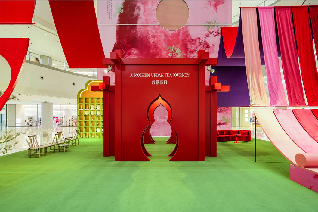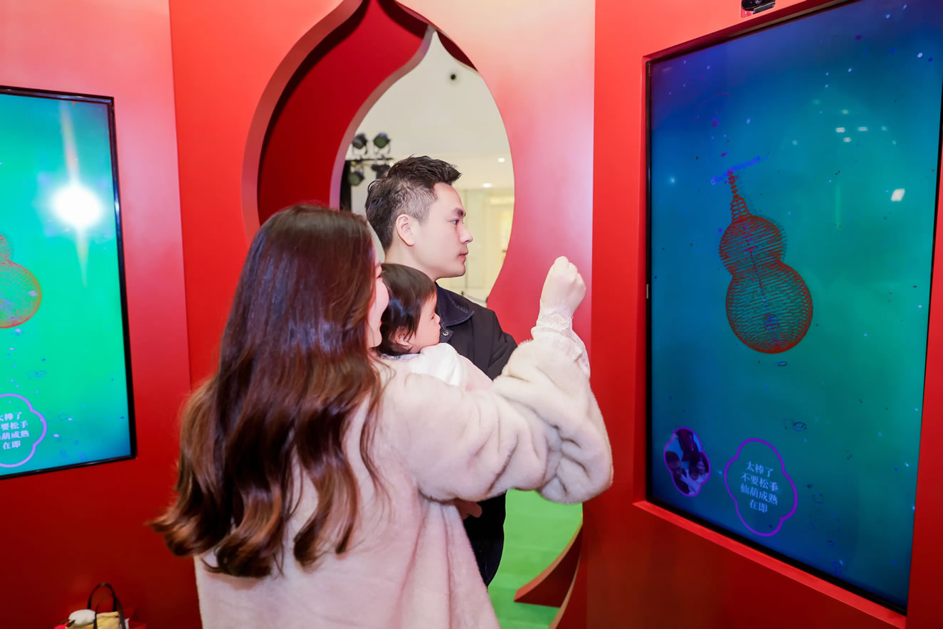 山水,并非遠(yuǎn)行才可得見。書法水墨藝術(shù)家劉玥首展作品《春山行遠(yuǎn)圖》以20米巨幅“山水開卷”,步入其中,與天地春意從容照面;紅色的帷幔落于銀色的松枝上,就像于山間松下靜謐的一隅,“幕下棲心”將是絕佳開年時(shí)尚大片的打卡處;松下銀椅,為你與摯友“漫敘往來”的相聚時(shí)刻營造出寧靜、松弛的氛圍;多寶閣中陳列著未經(jīng)雕琢的茶器素胚與場內(nèi)品牌萬仟堂,長沙尼依格羅酒店及tea'stone帶來的新春茶器,以“初芒蘊(yùn)能”詮釋著未來的無限可能與新生力量。轉(zhuǎn)身與“蒔光種愿” 四方亭相遇。葫蘆門朝四方而開,寓意著納四方福祿,步入其中,與數(shù)字交互藝術(shù)家吳旭首展作品《無限福祿》體驗(yàn)互動(dòng),跟隨指引揮動(dòng)手勢(shì),觸發(fā)粒子凝聚為動(dòng)態(tài)“福”字,親手完成一場新春祈福儀式。我們把象征團(tuán)圓與喜悅的紅色沙發(fā)打造“盞間聚暖”,如懷抱般圍合的布局作為“歸處”的隱喻。與家人團(tuán)聚便是心歸處,這將是中國年最圓滿的意象。