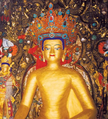 繼續(xù)右繞,穿過兩邊的夜叉殿和龍王殿,數(shù)百盞點(diǎn)燃的酥油供燈的后面便是著名的“覺康”佛殿。它既是大昭寺的主體,也是大昭寺的精佛之所在。佛堂呈密閉院落式,樓高四層,中央為大經(jīng)堂。藏傳達(dá)室佛教信徒認(rèn)為拉薩是世界的中心,而宇宙的核心便在于此處。這里是大昭寺僧人誦經(jīng)修法的場所。從大經(jīng)堂正可遙遙看見造型精美的千手千眼觀世音塑像,兩側(cè)有兩尊佛像,左為蓮花生,右為強(qiáng)巴佛塑像。大經(jīng)堂的四周俱為小型佛堂,除位于正中心的釋迦牟尼佛堂外,開間均不大但布置簡潔。釋迦牟尼佛堂是大昭寺的核心,這里是朝圣者最終的向往。此殿供奉的釋迦像是文成公主所帶的佛像。