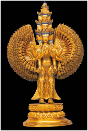 西藏本土制造的宗教文物,以金銅造像最著名。羅布林卡興建之初,七世達(dá)賴為給剛建好的宮殿佛堂添裝佛像及佛教用具,曾在布達(dá)拉宮腳下建立了一所名為“雪堆白”的造像場(chǎng),匯集了藏區(qū)內(nèi)幾百名能工巧匠,在這里精心打造各種佛像器物,以滿足拉薩及周邊地區(qū)寺院的需求。羅布林卡從初建到最后完善,每座佛堂里的大小佛像都被指定由“雪堆白”工匠量身定做打造。除此之外,園內(nèi)很多佛龕、宗教用具、金頂屋檐、門楣雕飾等,也都出自“雪堆白”工匠之手。“雪堆白”造像特點(diǎn)是制作精細(xì)、比例勻稱、色彩鮮明艷麗,佛像上的鍍金厚重,鍍金面光潔度高,佛冠、耳墜、臂釧、手鐲、飄帶等飾物,一律用綠松石鑲嵌。這些明顯特征,說明18世紀(jì)中葉以后,西藏本土佛像打造技術(shù)已步入了獨(dú)立發(fā)展的成熟階段。