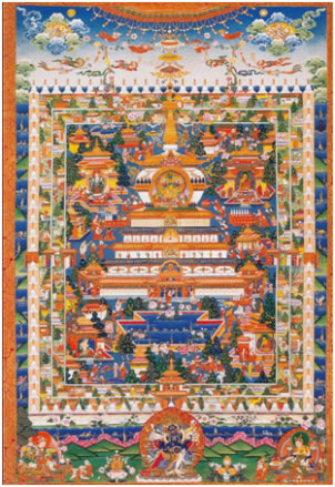 除佛像、佛塔外,唐卡收藏也是一大亮點(diǎn)。羅布林卡珍藏了大量18到20世紀(jì)勉唐畫派、欽則畫派和嘎赤畫派的各類作品。早期唐卡著名的有覺仲師徒像、帕木竹巴·多吉杰布像、印度尊者比瓦巴、那若巴像。其中覺仲師徒像唐卡,描寫的是印度尊者,噶當(dāng)派始祖阿底峽向貼身弟子仲敦巴(師徒合稱“覺仲”)傳授佛法的故事。畫面中心主尊阿底峽頭戴錐形遮耳帽,身披袈裟,雙手結(jié)說法印,給身旁仲敦巴講法,仲敦巴著藏式袍服,結(jié)跏趺坐,側(cè)身聆聽大師教誨。畫面上、下分別繪有如來、藥師、觀音、度母諸佛及繪畫施主像,人物刻畫逼真、栩栩如生,背景以朱砂填色,輪廓用金線勾勒。這件13世紀(jì)繪制的“赤唐”作品,十分稀有,彌足珍貴。另外,在收藏諸多的嘎赤畫派作品中,以84位印度大成就者唐卡最具特色。這些唐卡的畫面,不同以往其他畫派作品,構(gòu)圖較為簡(jiǎn)潔,色彩淡雅。人物形態(tài)被描繪的極為夸張,塑造了一個(gè)個(gè)特殊而詼諧逗趣的大成就者形象。這種一反常態(tài)的畫風(fēng)作品,在外邊難得一見。還有以唐卡形式繪制的《四部醫(yī)典系列掛圖》,收藏也比較完整。系列掛圖,藏族稱為“曼唐”,它是以彩色連環(huán)畫形式系統(tǒng)描述了藏醫(yī)藥學(xué)的基本理論,人類解剖構(gòu)造,生理功能、疾病診斷治療方法,各種藥物種類以及人類如何養(yǎng)生保健、飲食搭配等內(nèi)容!奥啤敝谱魍晟朴谇宕迨肋_(dá)賴?yán)锇⑼迳<未雸?zhí)政時(shí)期。最早成79幅,1916年十三世達(dá)賴?yán)锪钊擞衷鲅a(bǔ)了一幅“歷代西藏名醫(yī)圖”,形成80幅。這批系列掛圖,被視為標(biāo)準(zhǔn)藍(lán)本,完整保存在羅布林卡內(nèi)。