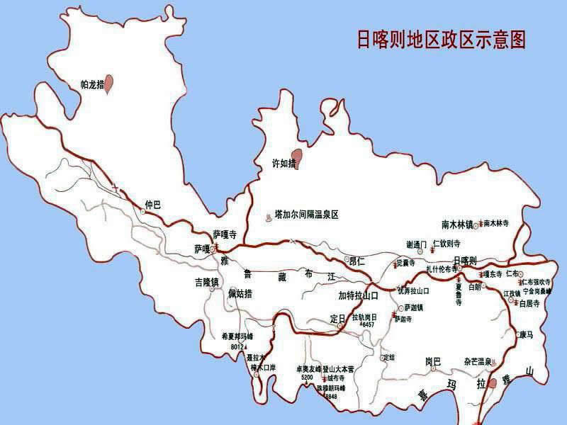 薩迦縣 面積8126平方千米,人口48766,政府駐薩迦鎮(zhèn),下轄2個(gè)鎮(zhèn)、9個(gè)鄉(xiāng)