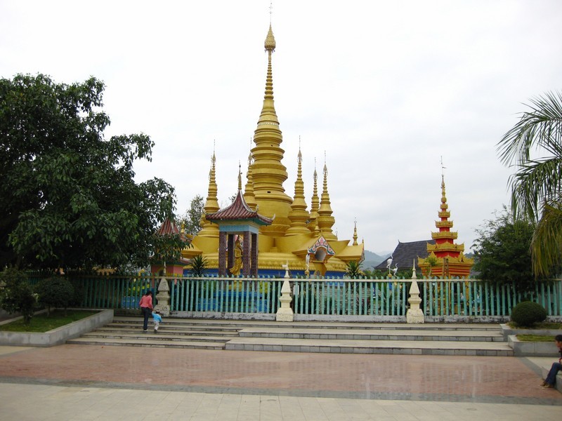 孟連金塔位于南壘河畔,建成于1997年,由8個(gè)小塔環(huán)抱一個(gè)主塔構(gòu)成,主塔高31.68米。