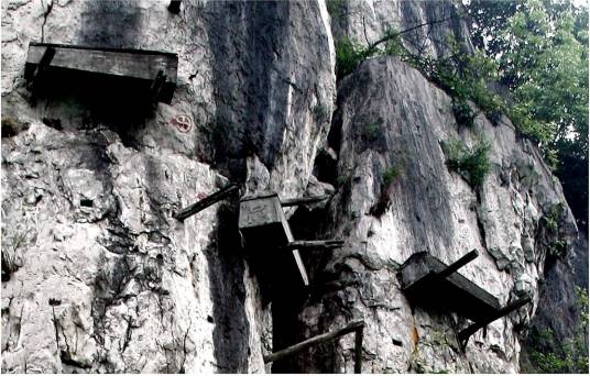 瓦石僰人懸棺位于威信縣長(zhǎng)安鄉(xiāng)瓦石行政村棺木崖和白虎巖上,與四川省珙縣僰人懸棺相同。棺前為林鳳河瓦石段。由于大量朽壞脫落,現(xiàn)懸棺3具,復(fù)制4具后計(jì)7具,民間傳說為何姓“白人子”墓。明代以前遺物,石上鑿孔,插入厚木,棺凌空橫置木上,任憑風(fēng)吹雨打。 掛于數(shù)百米懸崖絕壁上,是神秘和求知的象征。懸棺雖然經(jīng)過部分整理,但原貌基本尚存。2000年,已由奧地利王妃出資進(jìn)行保護(hù)。從山下仰望萬仞絕壁上的懸棺,給人的絕非是神秘和震撼的感覺。