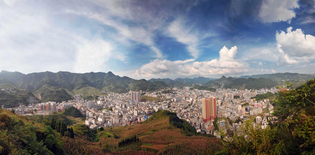 地形地貌 威信縣,地處四川盆地向云貴高原抬升過(guò)渡地帶。山脈系烏蒙山北延余脈,由西南部鎮(zhèn)雄縣入境,自西向東層層展布。以中部后山大嘴梁子一線(xiàn)為分水嶺,將全縣分為南、北兩部分,形成中部高、南部和北部低的魚(yú)脊形地貌。最高峰高田鄉(xiāng)楊龍塆梁子海拔1902米,最低點(diǎn)羅布河出境處海拔480米,平均海拔1131米?h城所在地扎西海拔1172.5米。山地占90%,河谷間小壩區(qū)占10%。