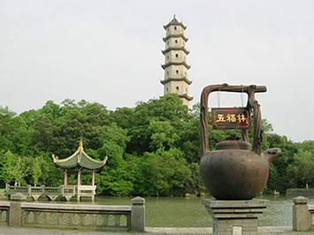 西塔始建于北宋開寶二年(969年),一說(shuō)建于唐咸通十年(869年),明、清曾多次修繕。塔高32米,底徑7米,6邊形,7層,中空,系樓閣式青磚仿木構(gòu)建筑。遠(yuǎn)遠(yuǎn)望去,碧水藍(lán)天,全身披綠的西峰山托著磚紅色寶塔,塔剎直入云端,蔚為壯觀。就近處,江風(fēng)吹動(dòng)四十二個(gè)檐角的銅風(fēng)鈴送聲,四周枝頭飛禽清脆的啼嗚,交響成趣。塔每層每面均有小佛龕,內(nèi)置石雕佛像,造型精致,神態(tài)自然,有頗高的藝術(shù)價(jià)值,塔周圍置青石坐凳,萬(wàn)木扶疏。因塔身傾斜,曾于1982年進(jìn)行大修葺。今塔仍保持宋代風(fēng)格。