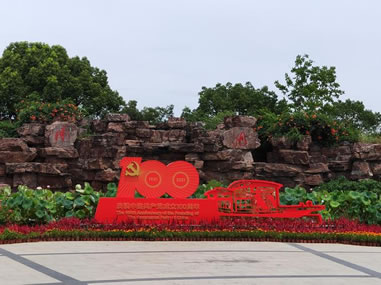 是為紀(jì)念中國(guó)共產(chǎn)黨第一次全國(guó)代表大會(huì)在南湖閉幕而建造的一座革命紀(jì)念館。作為中共“一大”會(huì)址重要場(chǎng)館和黨的誕生地,1959年根據(jù)有關(guān)部門的決定,經(jīng)中央審查同意,嘉興市籌建南湖革命紀(jì)念館,不僅仿制了南湖畫舫,還在湖心島建立了南湖革命紀(jì)念館,紅船?康暮男u成為最初的館舍,于煙雨樓大廳中開辟中共“一大”史料陳列。1991年7月,為慶祝中國(guó)共產(chǎn)黨成立70周年,紀(jì)念館移建南湖北岸,由鄧小平同志題寫?zhàn)^名,建設(shè)資金主要由黨員自愿捐獻(xiàn)。建成的紀(jì)念館由鐮刀、錘子形組成的紀(jì)念性建筑物,占地面積3800平方米,建筑面積1980平方米。紀(jì)念館坐北朝南,廣場(chǎng)上有高大威嚴(yán)的宣誓臺(tái)和大型石雕照壁以及四個(gè)火炬型花壇。在鮮花擁簇下,紀(jì)念館顯得莊嚴(yán)雄偉。沿著臺(tái)階進(jìn)入陳列大廳,正面是一艘南湖紅船模型和“中國(guó)共產(chǎn)黨第一次全國(guó)代表大會(huì)史料陳列”,兩個(gè)展廳分別布置了《中國(guó)共產(chǎn)黨第一次代表大會(huì)史料陳列》、《黨和國(guó)家領(lǐng)導(dǎo)人對(duì)南湖的關(guān)懷》等陳列,其中包括江澤民、胡錦濤、朱镕基、楊尚昆、宋平、姚依林、彭真等中央領(lǐng)導(dǎo)同志前來參觀、考察的照片和江澤民、李鵬、陳云、李先念等同志為紀(jì)念館的題詞。南湖革命紀(jì)念館是中國(guó)百個(gè)愛國(guó)主義教育基地之一,每年有近百萬的游人前來參觀瞻仰。