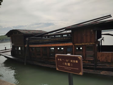 停泊在煙雨樓前水面上的,是1959年仿制的一條當(dāng)年"一大"開會(huì)的游船,作為"一大"會(huì)議紀(jì)念船,它向人們生動(dòng)展現(xiàn)了中國(guó)共產(chǎn)黨誕生的歷史場(chǎng)景。這條“一大”紀(jì)念船被人們親切地稱為“南湖紅船”。這是一艘中型的單夾弄絲網(wǎng)船,船長(zhǎng)16米,寬3米。內(nèi)有前艙,中艙,房艙和后艙,右邊有一條夾弄通道,中艙放一張八仙桌,周圍放桌凳和茶幾。當(dāng)年中共“一大”會(huì)議就是在中艙舉行。前艙搭有涼棚,房艙設(shè)有床榻,后艙置有櫥灶等物,船梢系有一條小拖梢船,為當(dāng)時(shí)接人進(jìn)城購(gòu)物所用.。1921年7月23日,中國(guó)共產(chǎn)黨第一次全國(guó)代表大會(huì)在上海秘密召開。會(huì)議臨近結(jié)束時(shí),遭法租界巡捕的襲擾而被迫停會(huì),根據(jù)上海代表李達(dá)的夫人王會(huì)悟的建議,8月1日會(huì)議轉(zhuǎn)移到嘉興南湖的一條游船上繼續(xù)舉行。在這條紅船上,會(huì)議通過了第一個(gè)《中國(guó)共產(chǎn)黨章程》,宣告了中國(guó)共產(chǎn)黨的誕生,從此中國(guó)革命翻開了新的一頁。