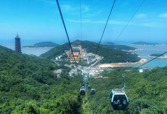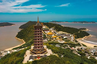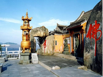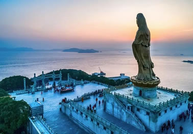普陀山,位于浙江省舟山市普陀區(qū),杭州灣南緣,舟山群島東部海域,相傳是觀世音菩薩教化眾生的道場。普陀山地形呈菱形狀,是舟山群島1390個(gè)島嶼中的一個(gè)小島,形似蒼龍臥海,面積12.52平方千米,與舟山群島的沈家門隔海相望,素有“海天佛國”、“南海圣境”之稱,南北長8.6千米,東西寬約3.5千米,岸線長30千米。中部佛頂山天燈臺(tái)最高,海拔291.2米,向四面延伸,西為茶山,北為伏龍山,東為青鼓壘山,東南為錦屏山、蓮臺(tái)山、白華山,西南為梅岑山,主峰均在100至200米間,連綿起伏。
